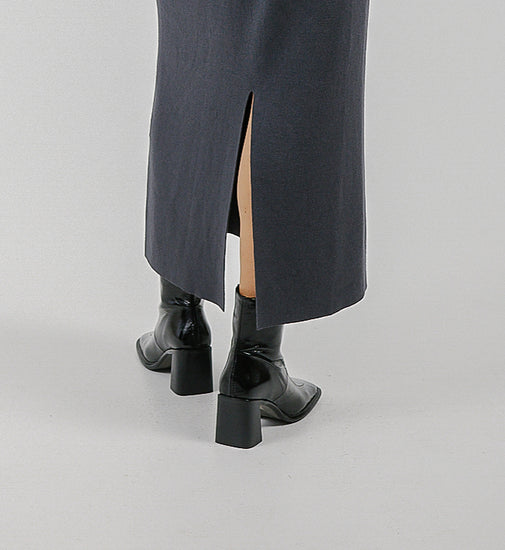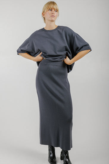 The perfect everyday ribbed-knit skirt that we cut to give a 'column' effect on the body (i.e. it's extra flattering). High-waisted with elastic opening. A medium-heavy weight knit that will keep your legs warm outside in winter.