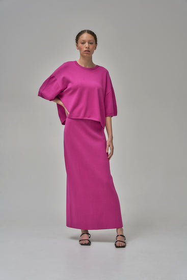 A t-shirt, but made of sweater material. We knit this specifically to create a beautiful silhouette. This looks great with anything, but particularly with the matching Long Skirt.