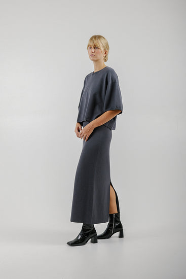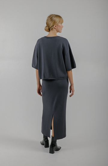 A t-shirt, but made of sweater material. We knit this specifically to create a beautiful silhouette.
